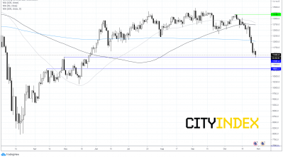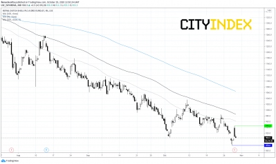 今天早上的官方數(shù)據(jù)顯示,日本9月失業(yè)率持平于3.0%,低于3.1%的預(yù)期值。與此同時(shí),工業(yè)產(chǎn)出月率上升4.0%,好于上升3.0%的預(yù)期值。技術(shù)面看,美元/日元日?qǐng)D受制于一根下降趨勢(shì)線與下降的50天均線(藍(lán)色線)。讀者或因此考慮在水平阻力位1