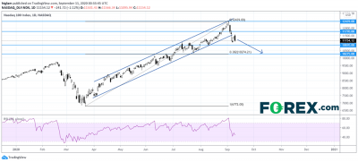 周四,美國股市收盤走低,回吐前一交易日大部漲幅。道瓊斯工業(yè)平均指數(shù)下跌405點(-1.5%)至27534;標(biāo)普500指數(shù)下跌59點(-1.8%)至3339;納斯達克100指數(shù)下跌241點(-2.1%)至11154。納斯達克100日線圖:來源